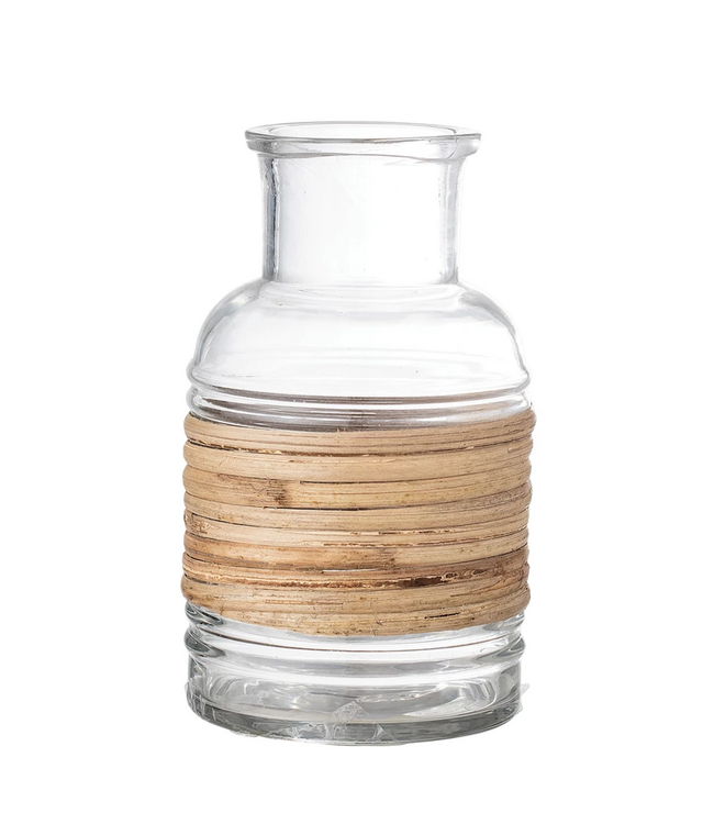 Bring warmth and organic texture into your space with this rattan wrapped glass vase. Combining the simplicity of clear glass with the natural beauty of woven rattan, this piece offers a balanced mix of clean and rustic design.
