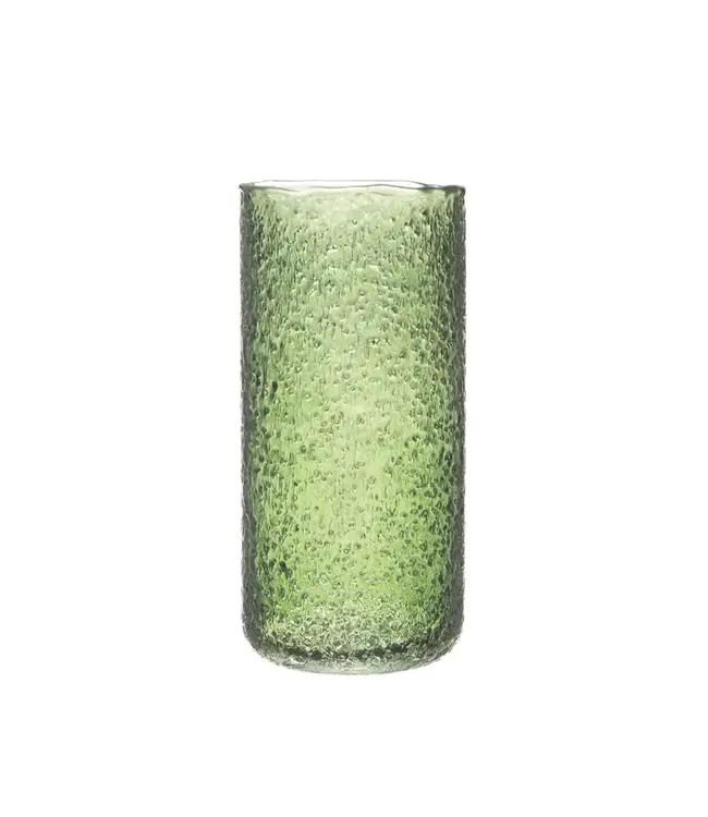 A glass vase featuring a soft green tint with a textured bubble finish. Its sleek cylindrical shape adds a fresh, modern touch to any space. Read more.