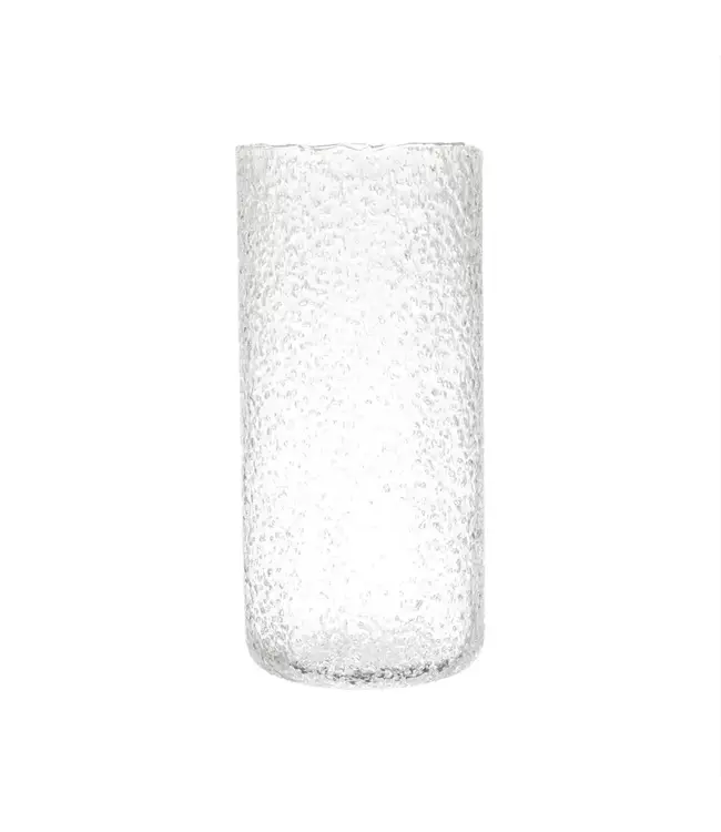 A clear glass vase featuring a textured bubble finish and sleek cylindrical shape. Its airy design adds subtle texture and modern elegance to any space. Read more.