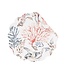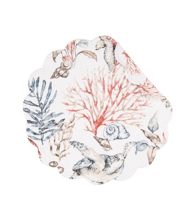 The Shelly Shores table linens provide a coastal escape complete with sketched coral and shells in a coral and blue color palette; reversing to a coral-on-white look offering two coastal looks for your dining space.