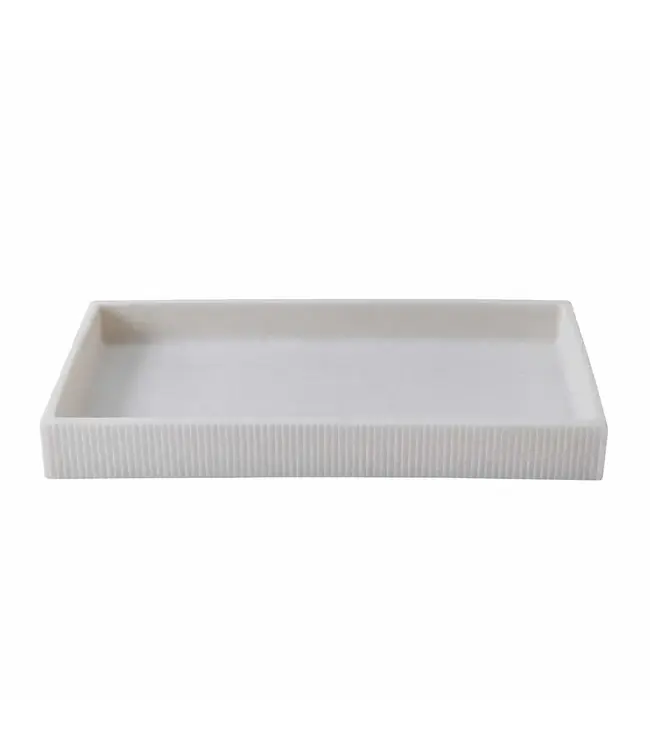 The collection showcases a staggered geometric line pattern, with variations across pieces: the soap dish and tray feature smooth interiors framed by matching ridged exteriors, while the lotion dispenser and tissue holder maintain a sleek, smooth top surface for a refined look. Durable and stylish, these accessories are designed to enhance your daily routine with contemporary elegance. Make sure to check out the rest of the collection!